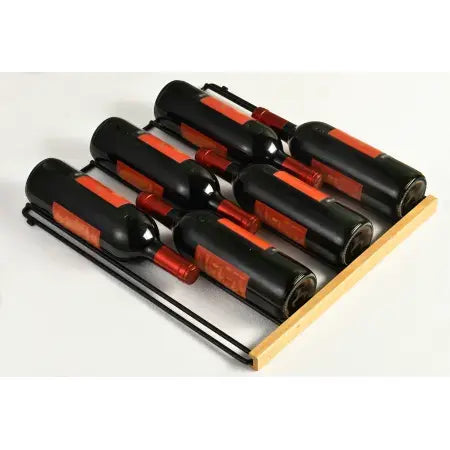 The unit features elegant metal shelves adorned with a wood face, beautifully cradling your wine bottles while adding a touch of sophistication to your space. The interior is further enhanced by gorgeous blue LED lighting, illuminating your collection and creating a stunning visual display.